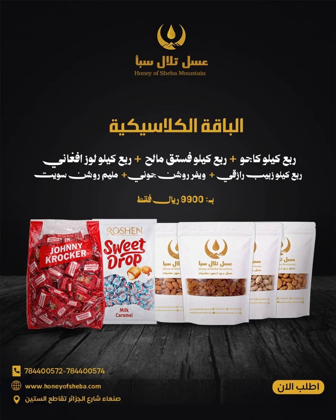 ربع كيلو كاجو + ربع كيلو فستق مالح + ربع كيلو لوز أفغاني + ربع كيلو زبيب رازقي + ويفر لوشن جوني + مليم روشن سويت
