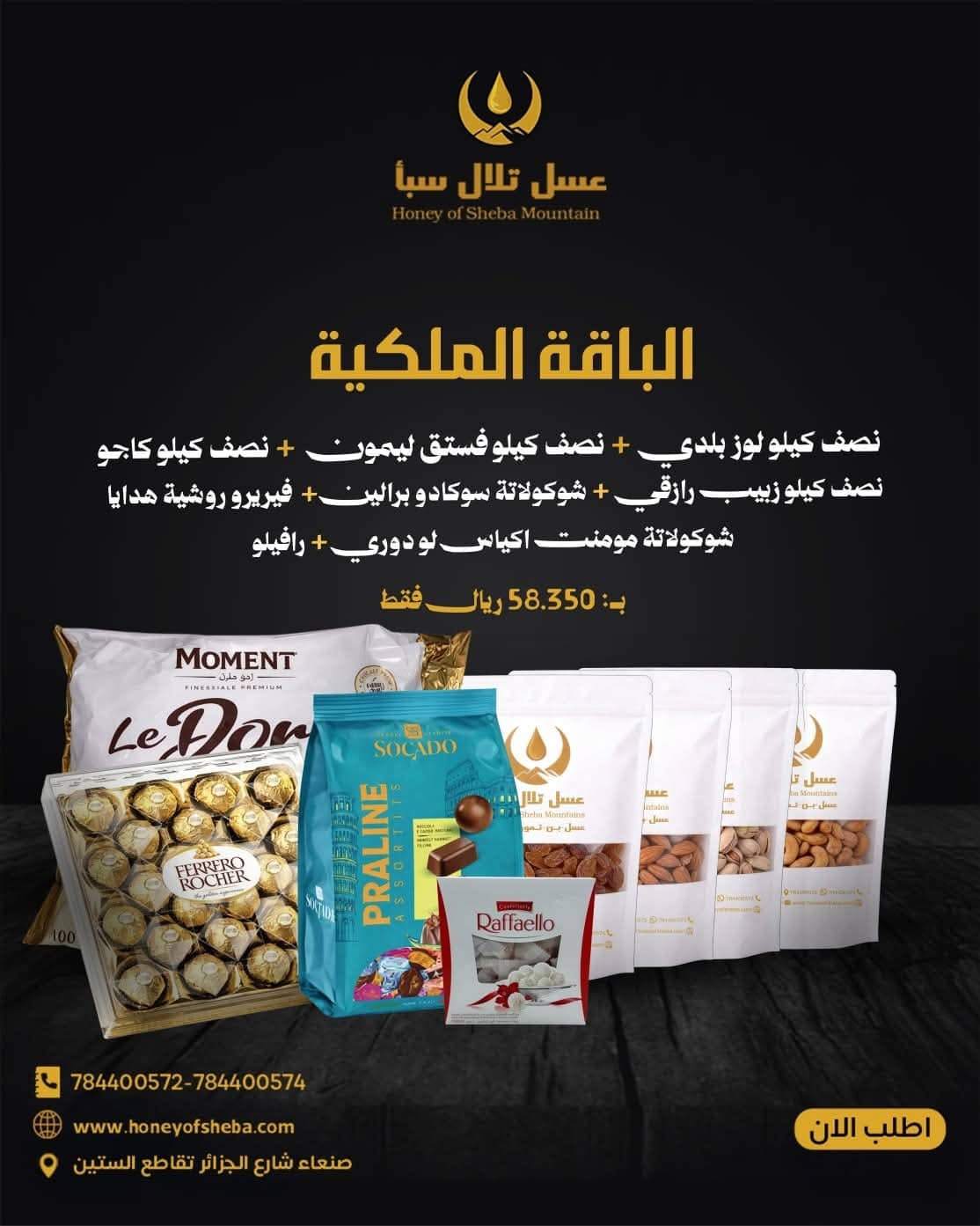 نصف كيلو لوز بلدي + نصف كيلو كاجو + نصف كيلو فستق ليمون + نصف كيلو زبيب رازقي + شوكولاتة يوكادو برالين + فيريرو روشية هدايا + شوكولاتة مومنت + رافيو